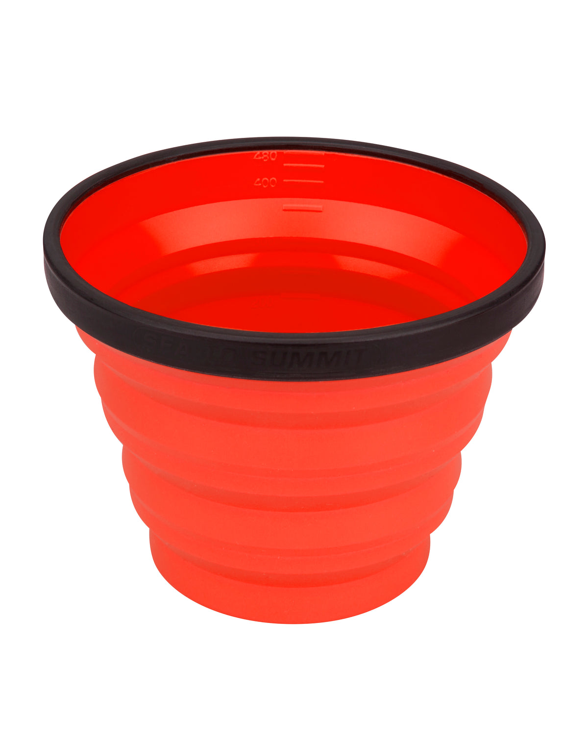 The X-Mug is a collapsible camp mug with a 480 ml capacity that is also calibrated as a measuring cup. The food-grade, flexible silicone sides collapse making it a small compact disc sized dinnerware piece that nests neatly with other X-Series dinnerware and X-Pots, while the rigid ring creates a sturdy drinking vessel and prevents scalded fingertips.